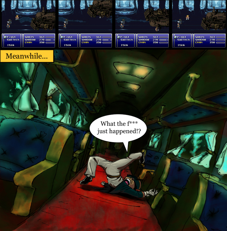 Final Fantasy VI[1] was first released on the Super Nintendo Entertainment System in April 1994, followed by a North-American release in October of the same year. In the game, the player comes across the Phantom Train,[2] a dungeon and similar named boss fight with a sentient train locomotive that carries the dead to the other side. During the fight, in which the party is running away from the still moving train, the monk Sabin[4] is able to perform his move “Suplex” (renamed “Meteor Strike”[3] in later versions) on the locomotive, lifting the entire train up into the air and slamming it into the ground. The fact that Sabin is able to perform this move on the train can be considered an oddity within the game,[10] as most large enemies and bosses are immune to the attack.
