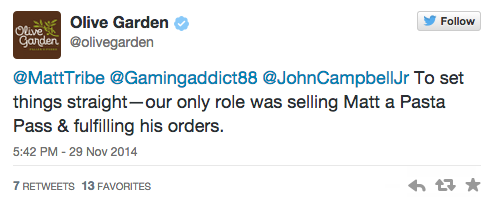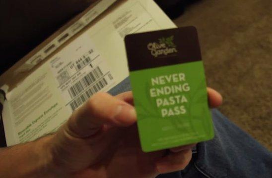 On September 8th, 2014, Matt Tribe of Salt Lake City, Utah signed up for Olive Garden’s limited-quantity “Never Ending Pasta Pass” program, which allows its cardholders unlimited pasta for seven weeks for a one-time payment of $100, after reading about the deal in a USA Today news article.