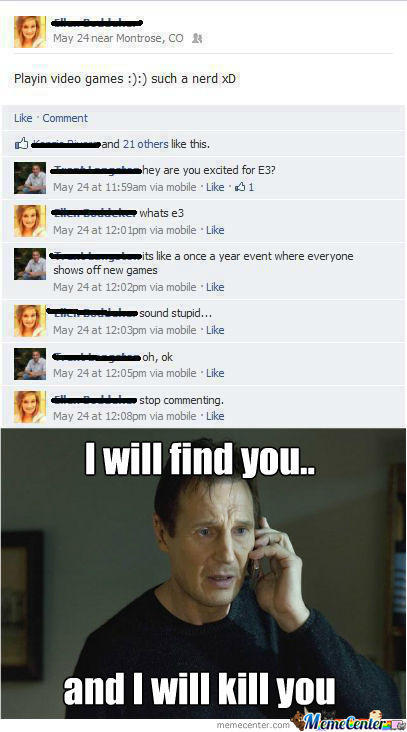 I will find you and I will kill you, also known as the Taken meme is a memorable quote from 2008 thriller movie Taken. Online, it has been reused in image macros as a reaction towards anything that could trigger the urge of wanting to kill someone.