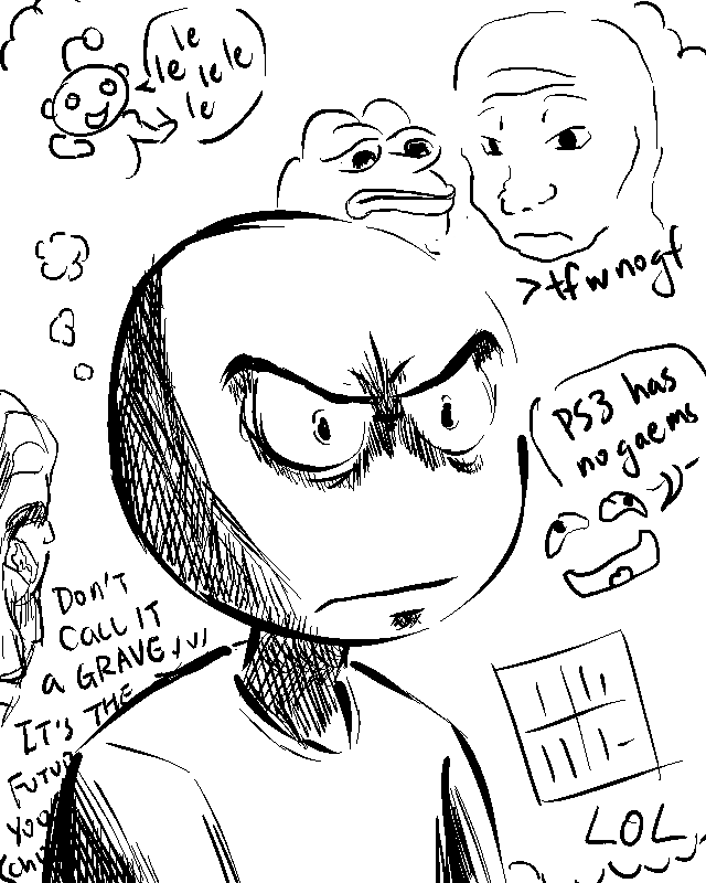 /v/-tan is the board-tan for the Video Games board. He is one of the oldest board-tans, debuting in the Three Angled Blue comics, and has maintained a fairly steady appearance. His design is fairly simple, being that of a young man with a round head derived from the appearance of Rage Guy wearing a t-shirt. He is seen as vitriolic and misanthropic, to the point that his rage allows him to perform many incredible feats of strength. He is occasionally seen alongside Vivian James, who is established to be his daughter, in comics about the GamerGate controversy.[10][11]
