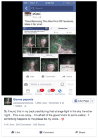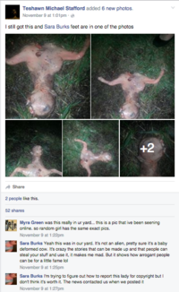 Midday on November 9th, 2015, a Facebook user named Teshawn Michael Stafford posted several pictures on his Facebook profile of a deformed, miscarried cow fetus.[9] The pictures were then re-uploaded to a Facebook page titled Gianna Peponis, where the poster claimed that after the missile launch was seen, she heard a scream and went to her California backyard, where she took photographs of an unknown creature she found.[10] The pictures went viral with the misappropriated information, including being reported on in the Inquisitr and the Daily Mail[11][12] and a highly upvoted post on /r/WTF.[13]
